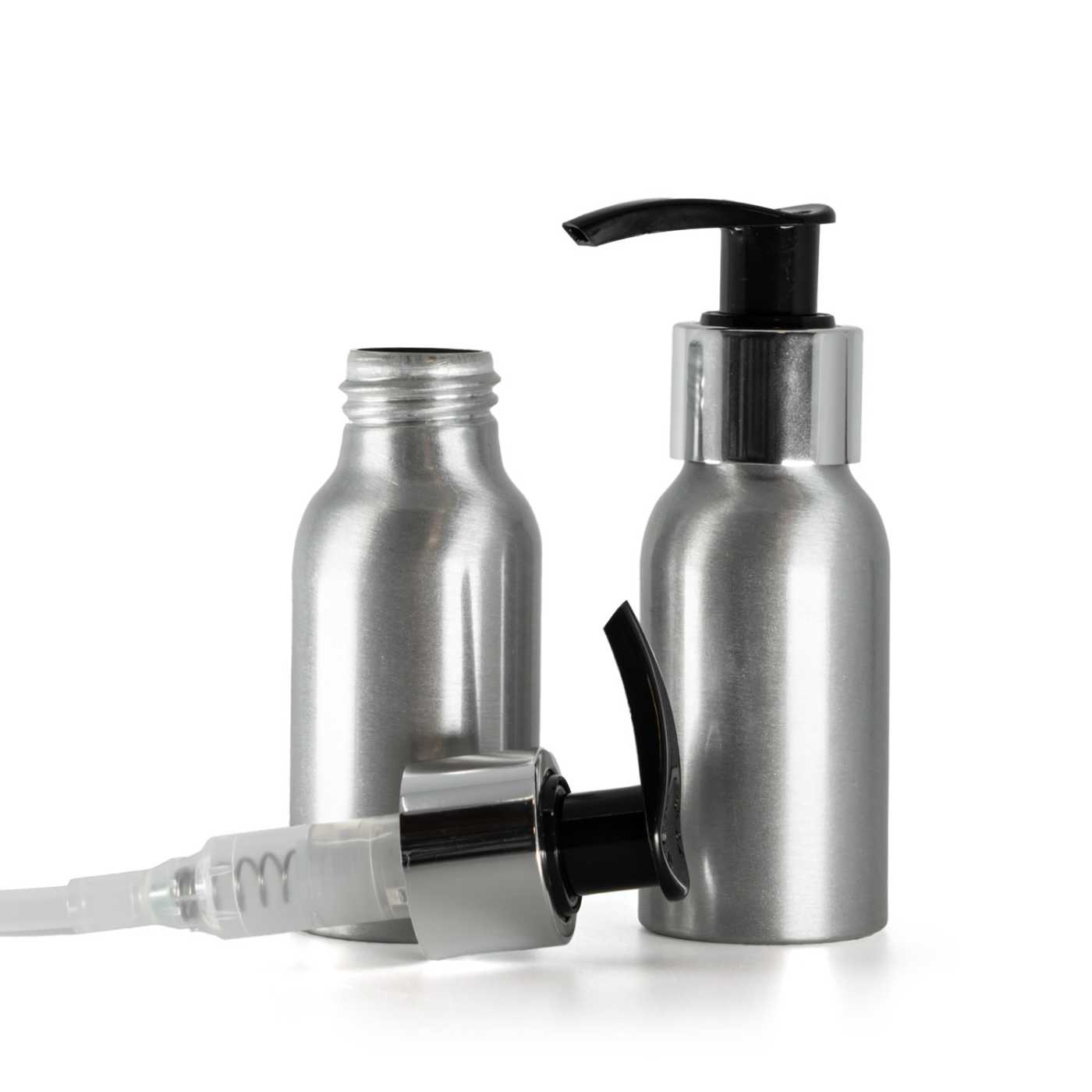 Aluminium Bottle, Black Lotion Pump With Glossy Silver Collar, 50 ml