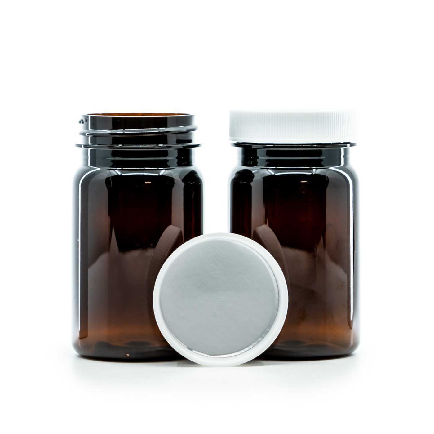 Amber Plastic Pill Jar, White Lid, Induction Innerseal, 100 ml