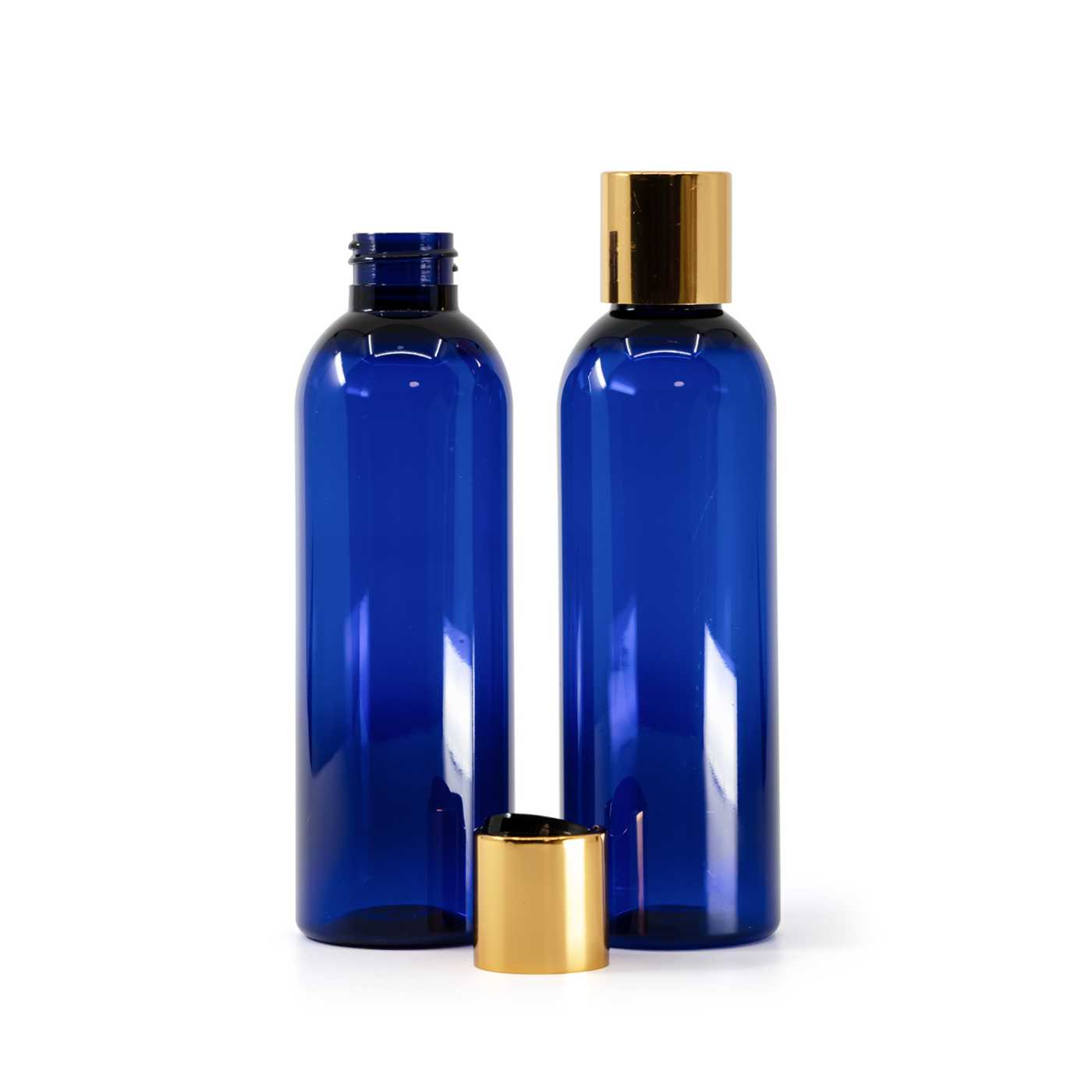 Blue Plastic Bottle, Black Plastic Flip Top With Golden Aluminum Collar, 200 ml