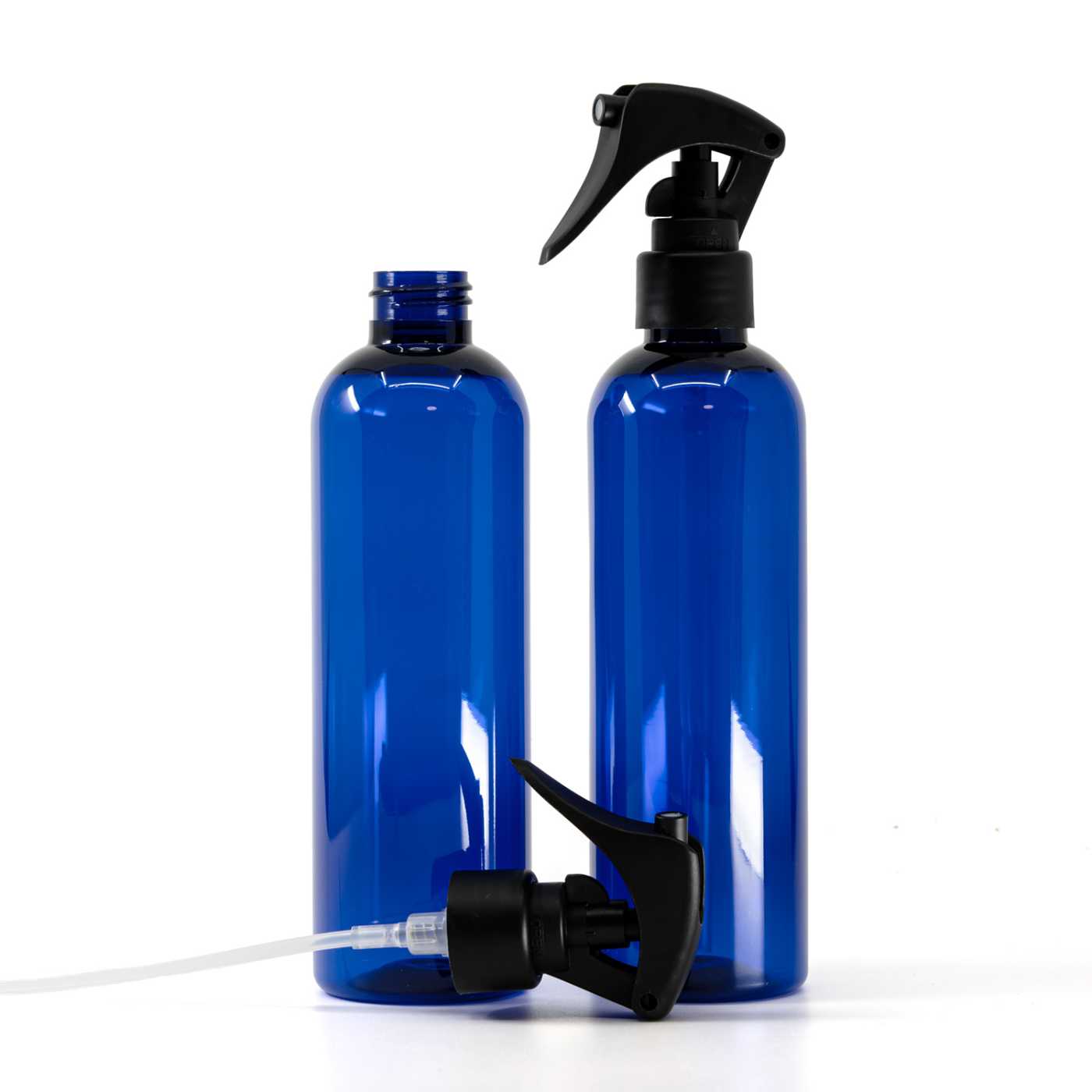 Blue Plastic Bottle, Mini Trigger Spray, Matte Black, Smooth Collar, 250 ml