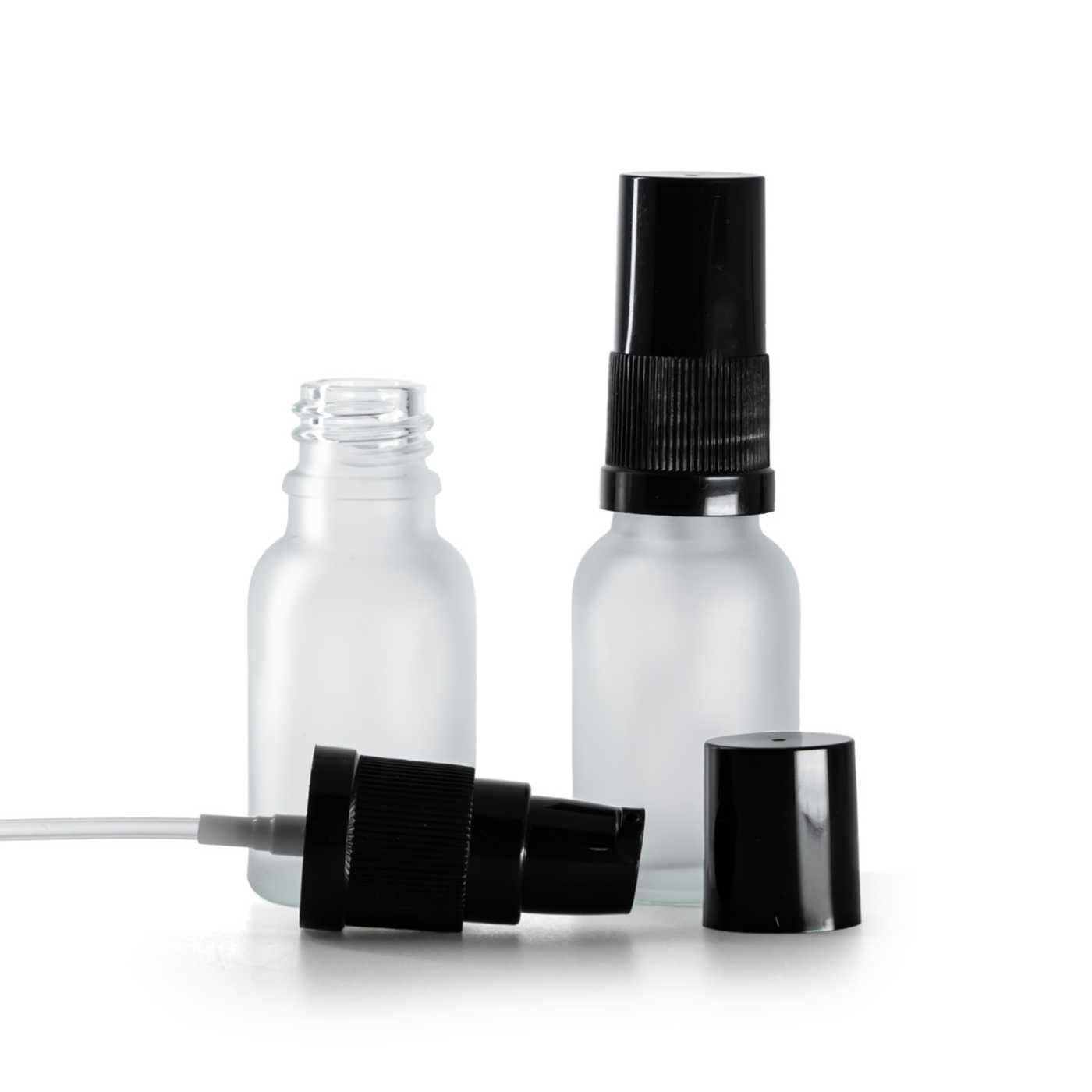 Clear Frosted Glass Bottle, Black Lotion Pump with Black Overcap, 15 ml