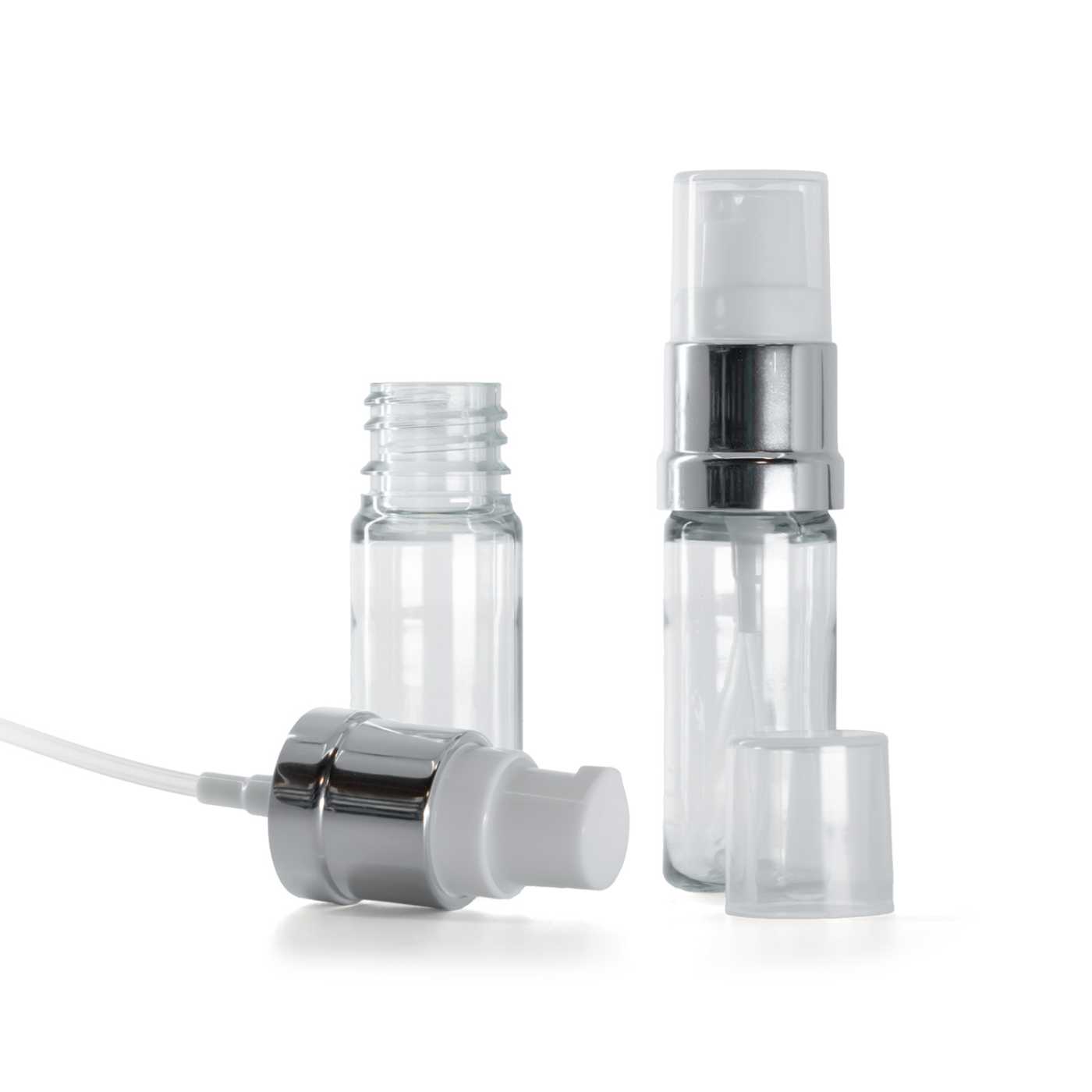 Clear Plastic Bottle, Glossy Silver White Pump, 10 ml