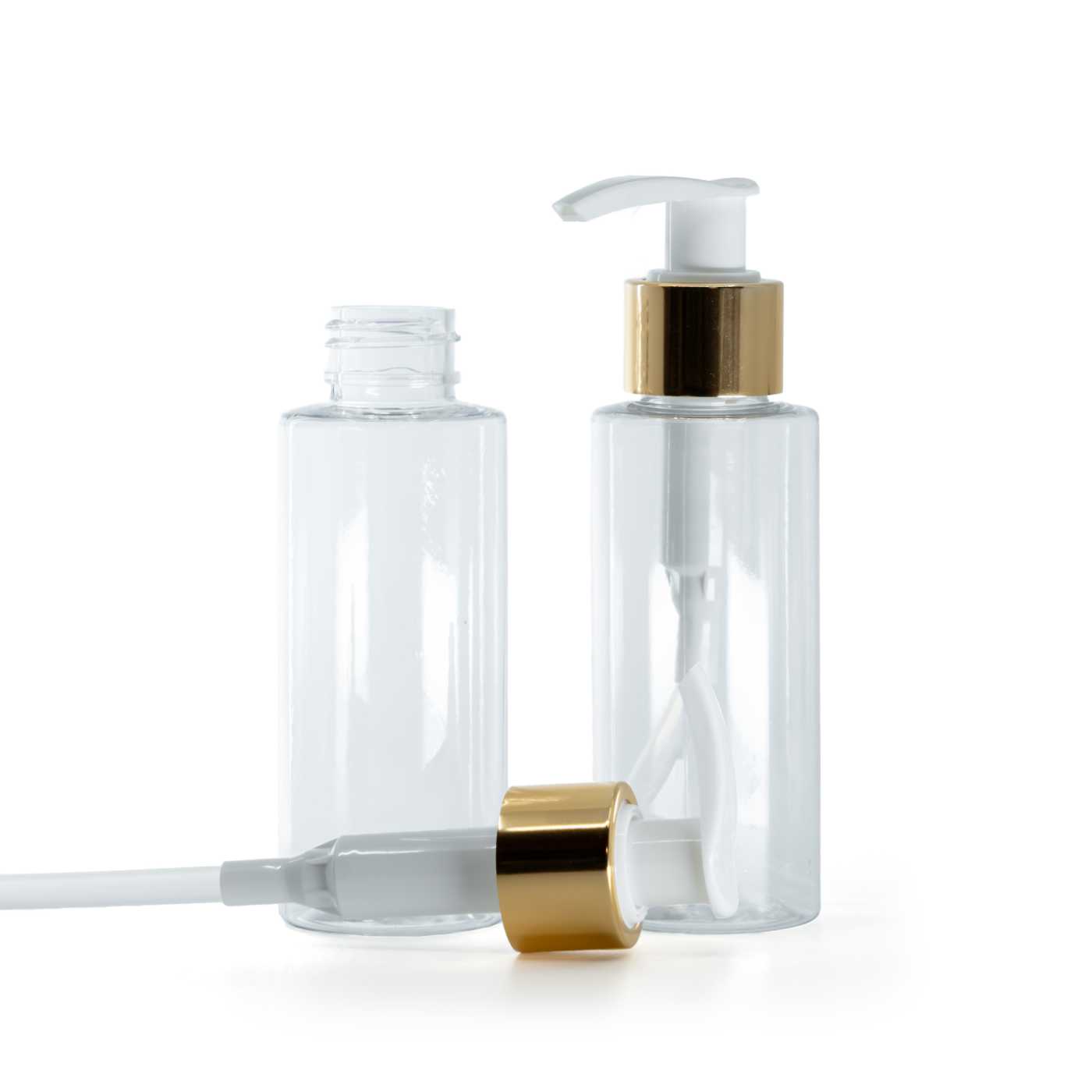 Clear Plastic Bottle, White Lotion Pump With Glossy Gold Collar, 100 ml