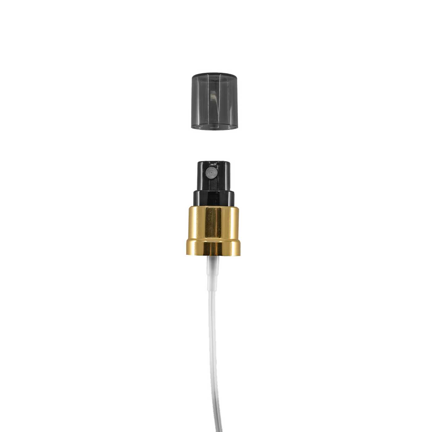 Black and gold plastic atomizer with transparent smoke cap, suitable for bottle with neck diameter 18 mm.Neck: 18/415Length of tubing: 115 mmDosage: 0,14 ml each