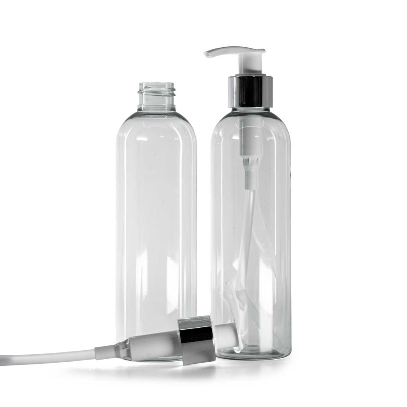 Transparent plastic bottle, ideal for storing a variety of liquids, oils, lotions, etc. It is semi-rigid, but can be squeezed. Made of recycled plastic.Volume: 250 mlBottle material: PETLid material: PPDiameter of top: 24/410