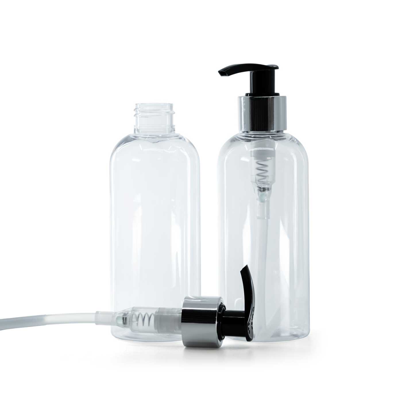 Rounded Clear Plastic Bottle, Black Lotion Pump With Glossy Silver Collar, 200 ml