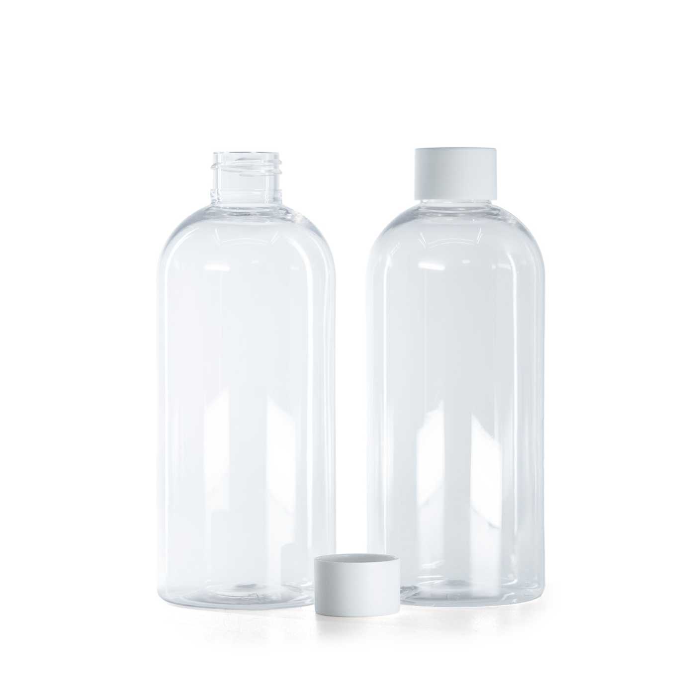 The transparent round plastic bottle with a matte white cap represents a practical, lightweight and durable packaging, ideal for filling various liquid and gel-based preparations. The transparent design allows clear visual control of the contents, which makes dosing, monitoring consumption and presenting the product to the end customer easier. Thanks to the high-quality plastic material, the bottle is suitable for cosmetic formulations as well as other liquid mixtures where the combination of low weight, resistance to damage and an aesthetically clean appearance is important.