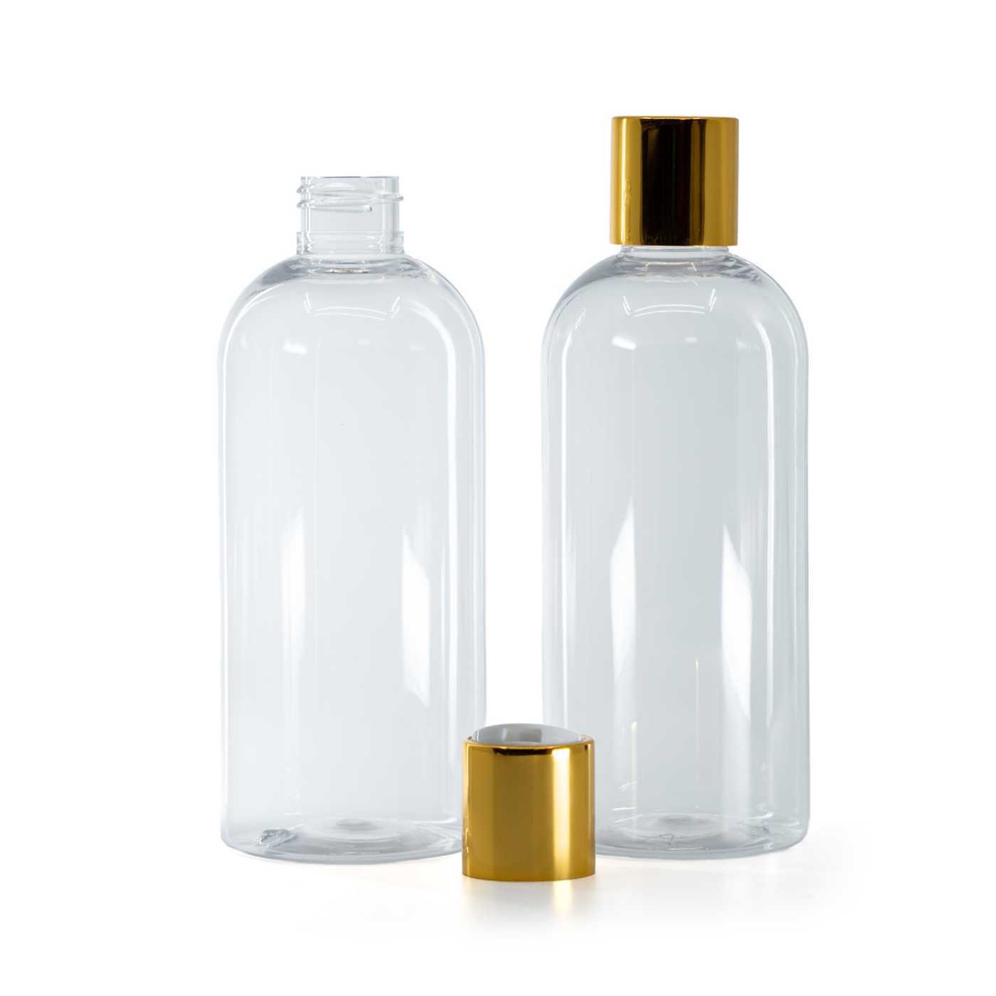 Rounded Clear Plastic Bottle, White Plastic Flip Top With Golden Aluminum Collar, 300 ml