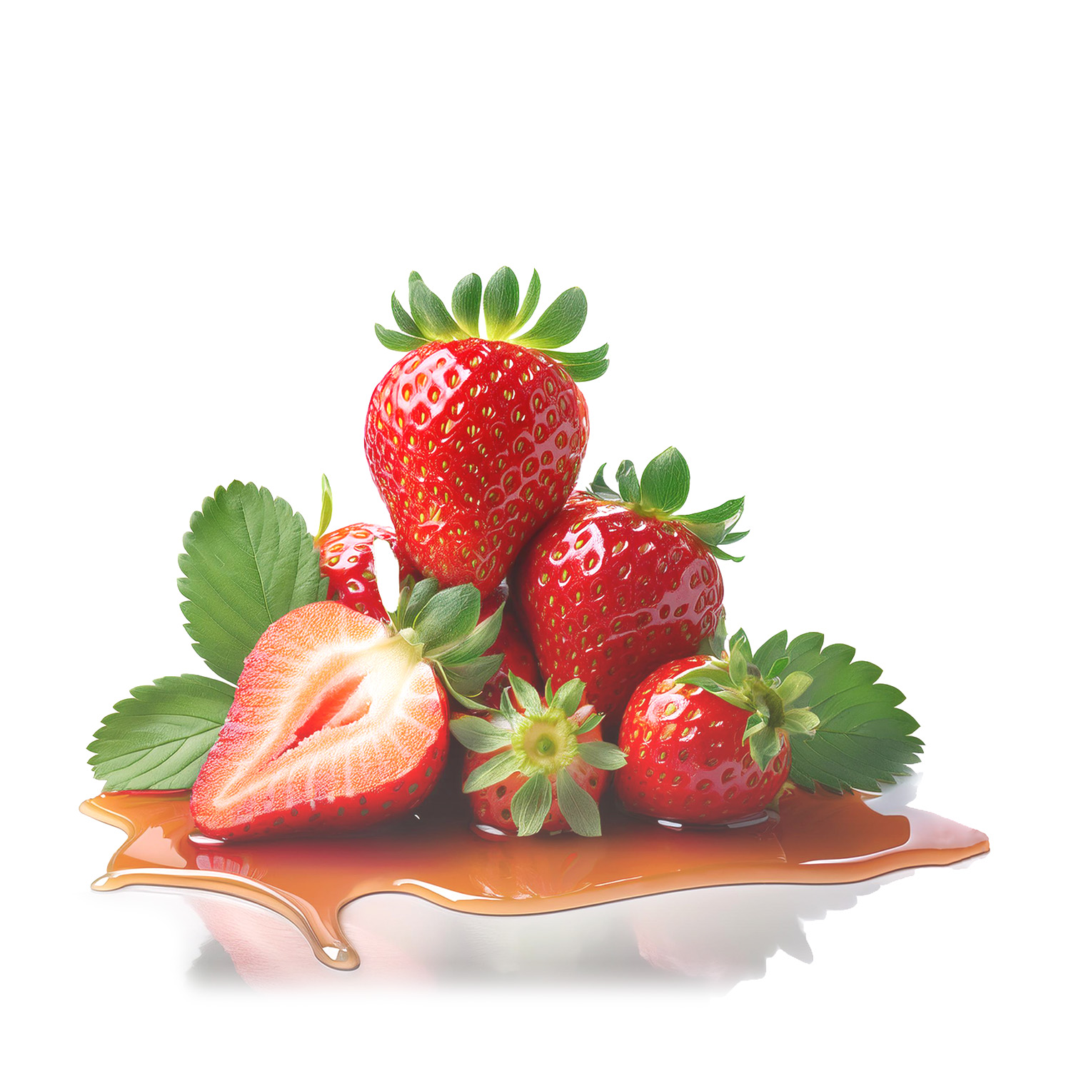 A large, juicy and sweet strawberry with a distinctive flesh flavour, a touch of green leaves and a drop of maple syrup to preserve the sweetness.