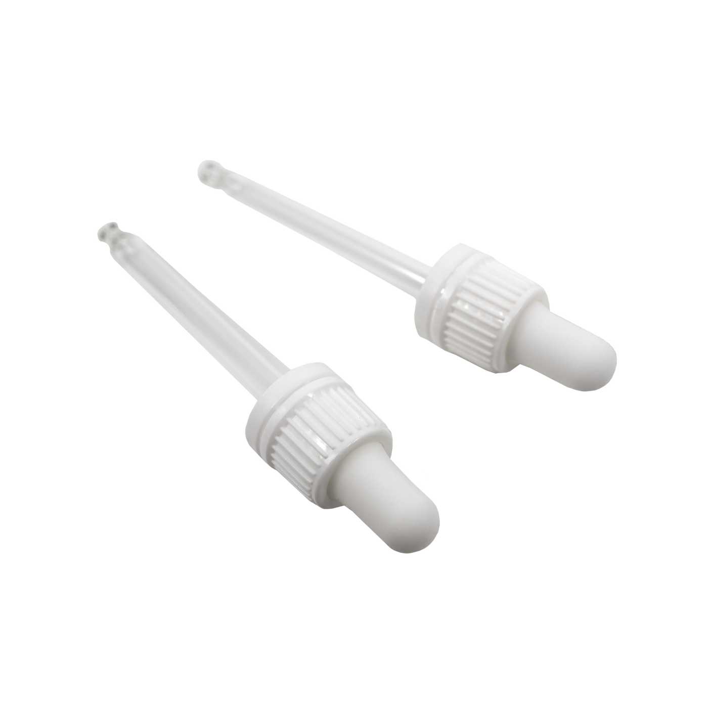 White plastic dropper, suitable for bottle with a neck diameter of 18 mm and a volume of 30 ml.Length of glass tube: 71 mm