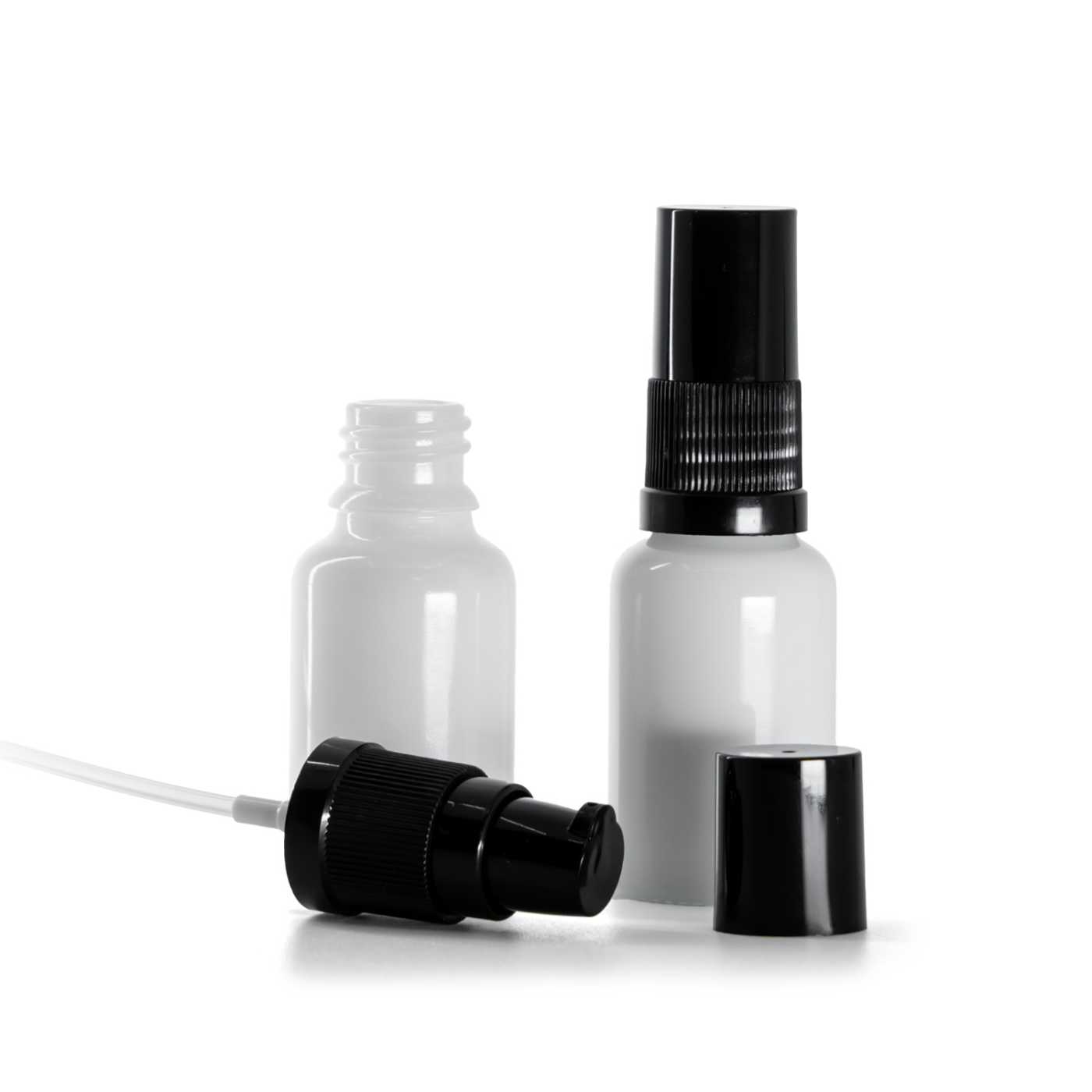 White Glass Bottle, Black Lotion Pump with Black Overcap, 15 ml