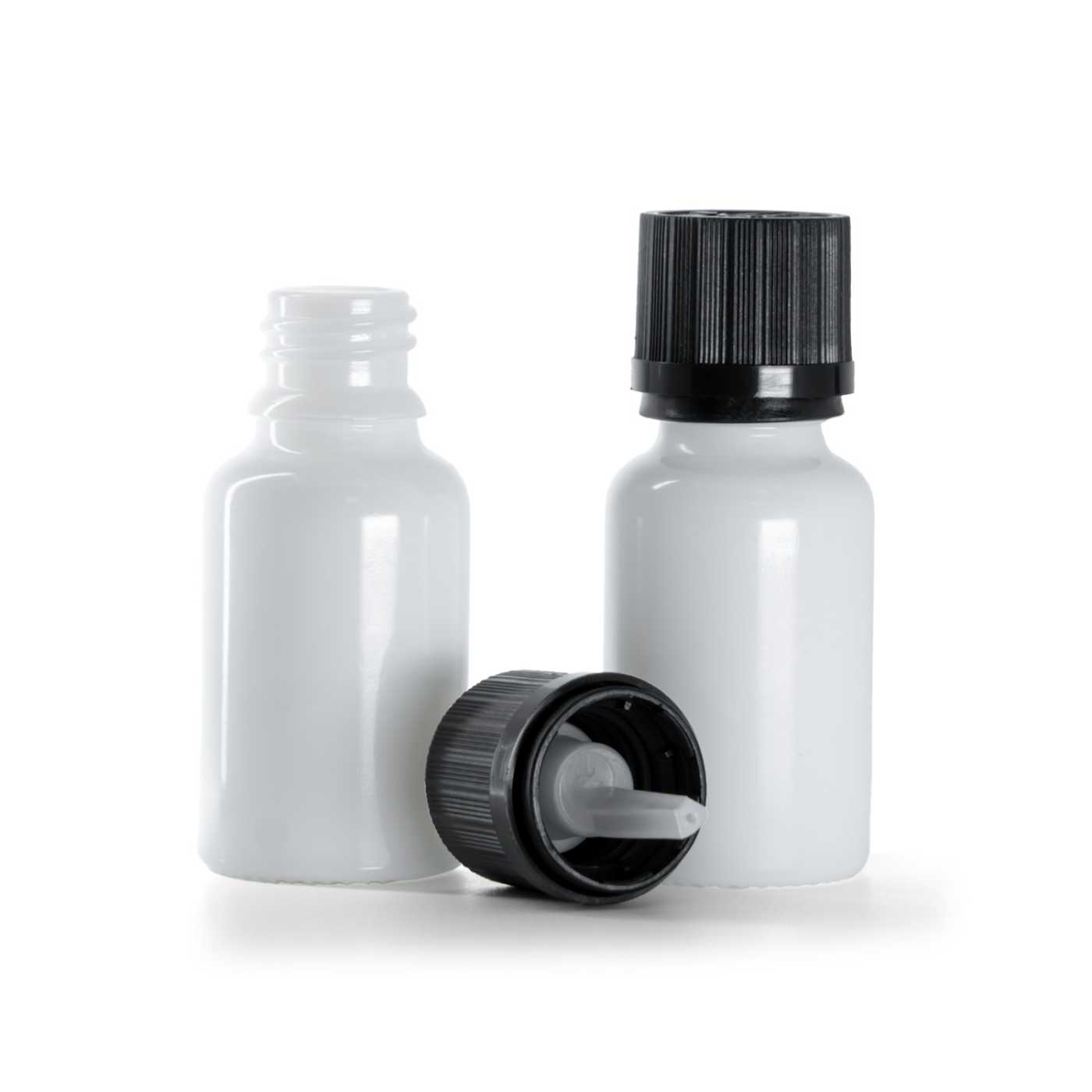 White Glass Bottle, Black Safety Cap & Dropper 15 ml