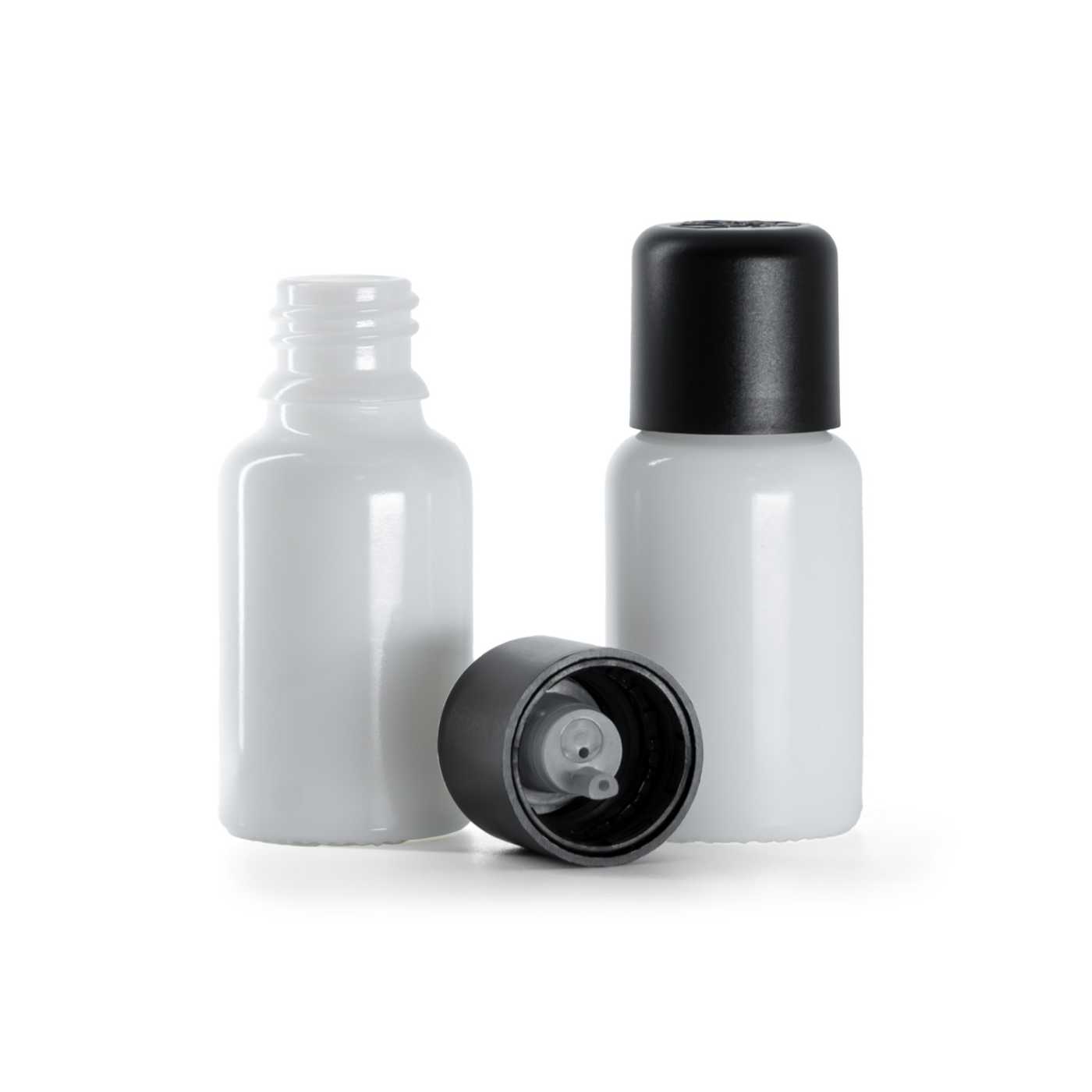 The white glass bottle, the so-called vial, is made of thick glass. It is used for storing liquids.Volume: 15 ml