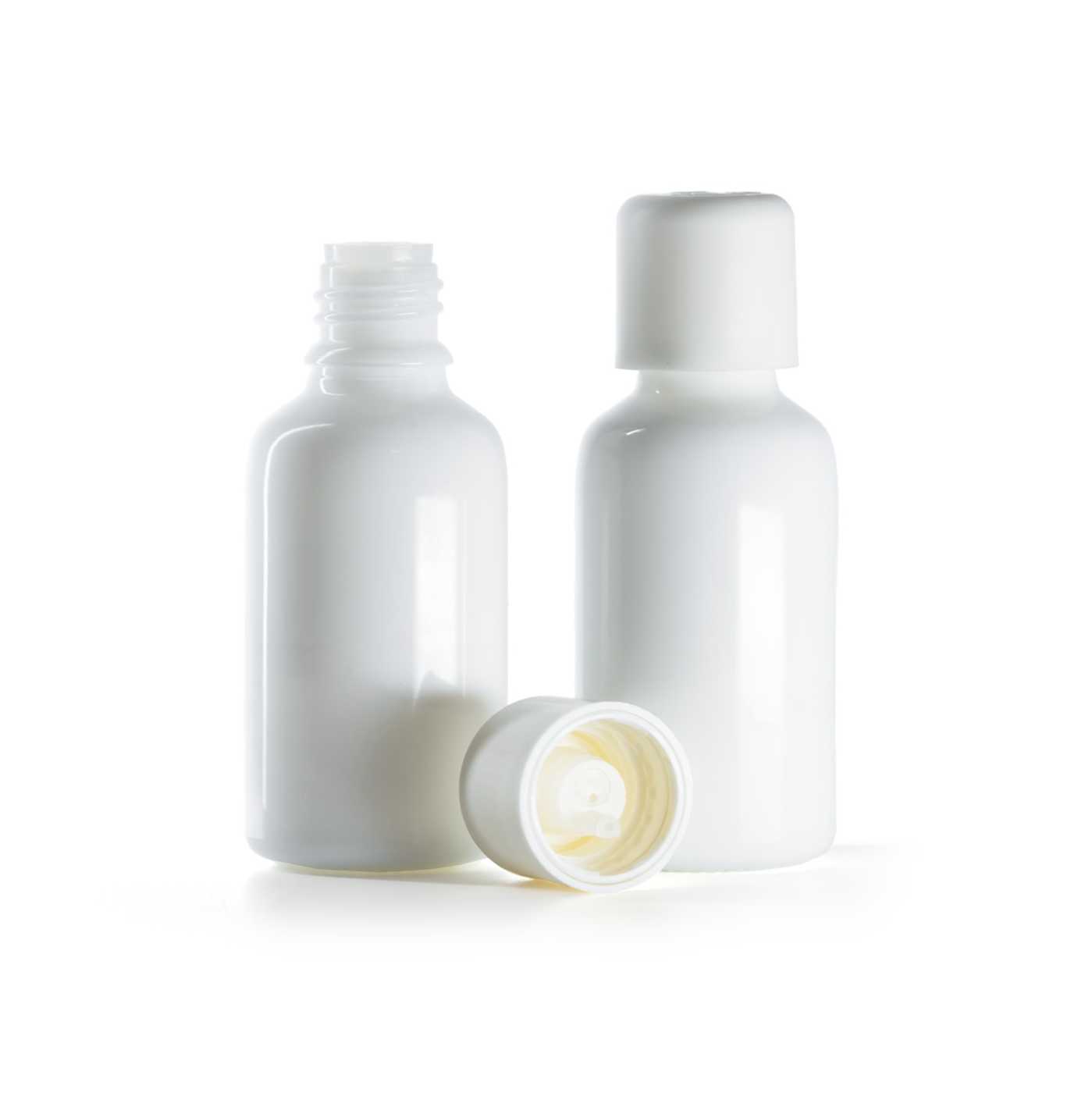 The glass vial with white safety closure is a professional packaging suitable for filling sensitive liquid preparations that require reliable sealing and controlled dosing. The sturdy glass bottle combined with a safety cap with safety lock helps protect the contents against unwanted opening while ensuring the stability of the packaged product during storage and transport.