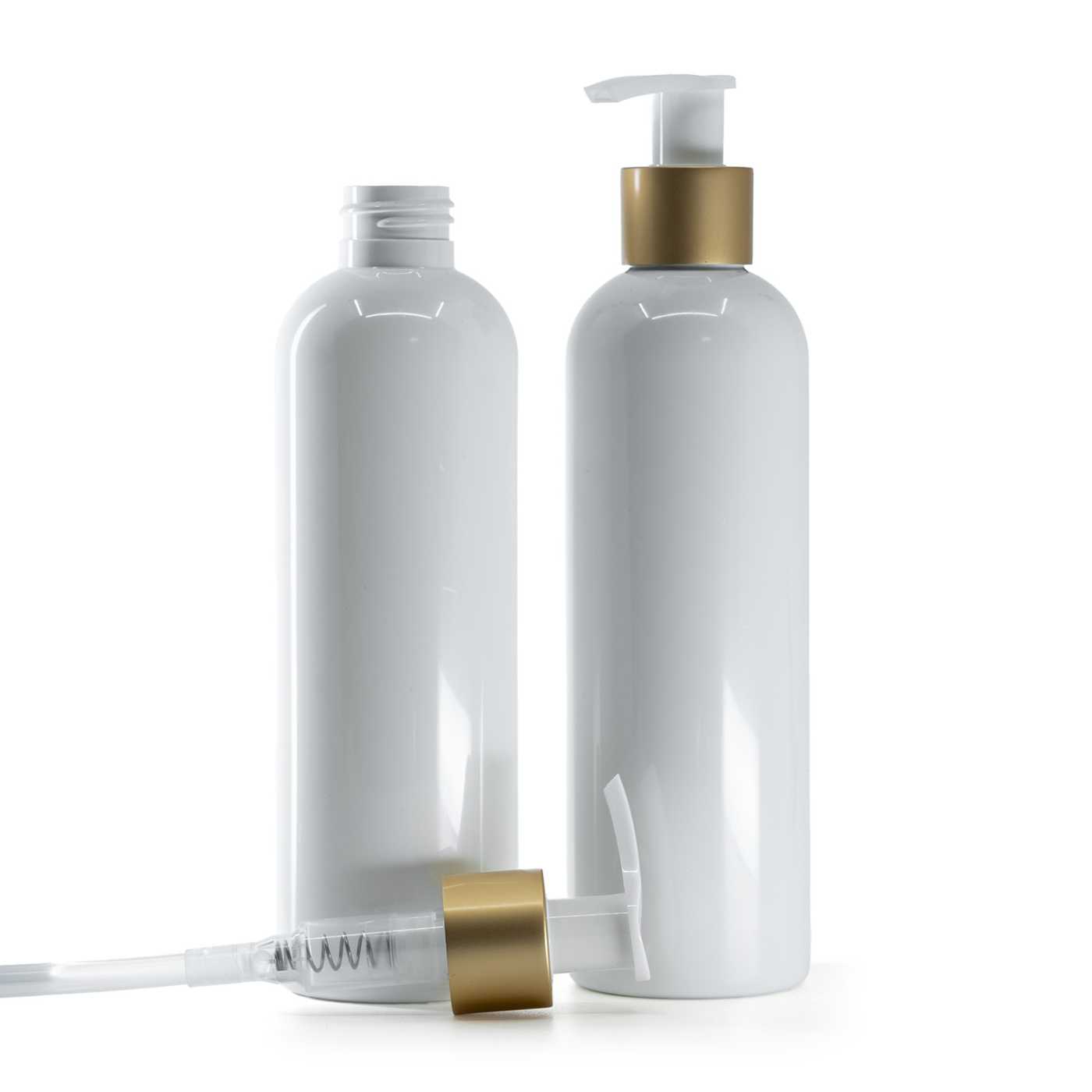 White Plastic Bottle, White Lotion Pump With Matte Gold Collar, 250 ml